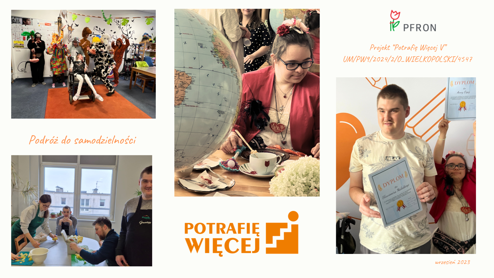 Dzięki dofinansowaniu naszych bieżących działań z dotacji PFRON nasi podopieczni (beneficjenci projektu POTRAFIĘ WIĘCEJ V - umowa UM/PW9/2024/2/O_WIELKOPOLSKI/4547(etap II)) mogą bezpłatnie uczestniczyć w różnego rodzaju zajęciach terapeutycznych, między innymi w codziennych zajęciach dla dorosłych "Podróż do samodzielności"